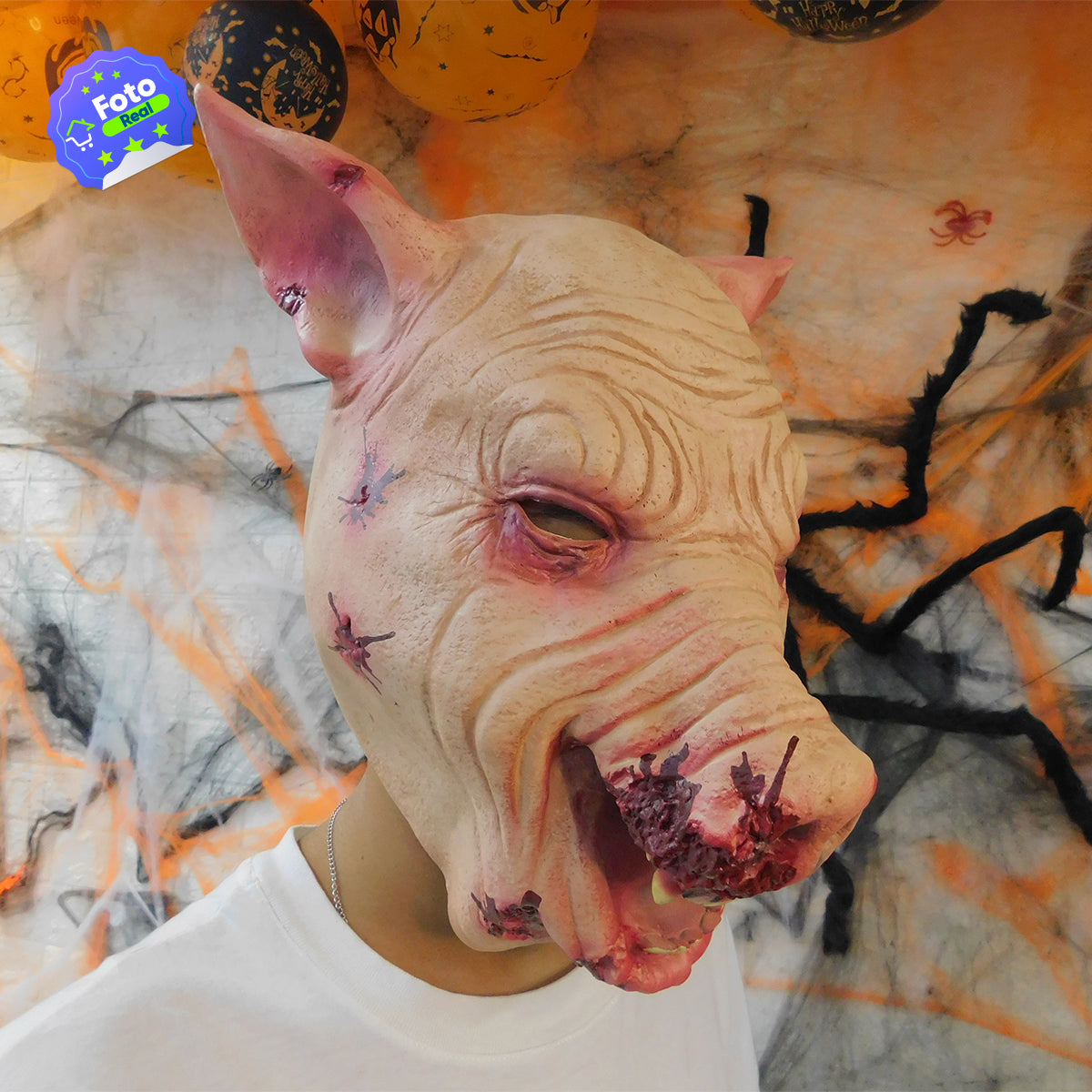 La máscara de cerdo diabólico está fabricada en látex premium, con detalles sangrientos y texturas que parecen reales. Cómoda, resistente y diseñada para asustar con estilo.